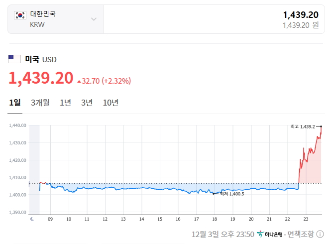 한국에서 비상계엄령이 선포되면서 경제에 큰 충격을 주고 있습니다. 특히 원화 가치가 급락하며 환율이 1,439.20원에 도달하는 등 급격한 변동을 보였습니다. 환율은 계속해서 변화하는 상황이지만, 현재의 급등 상황은 한국 경제에 어떤 영향을 미칠까요? 오늘은 비상계엄령 선포 후 환율 급등의 원인과 그로 인한 경제적 영향을 분석하고, 우리가 취해야 할 대응 방안에 대해 알아보겠습니다.